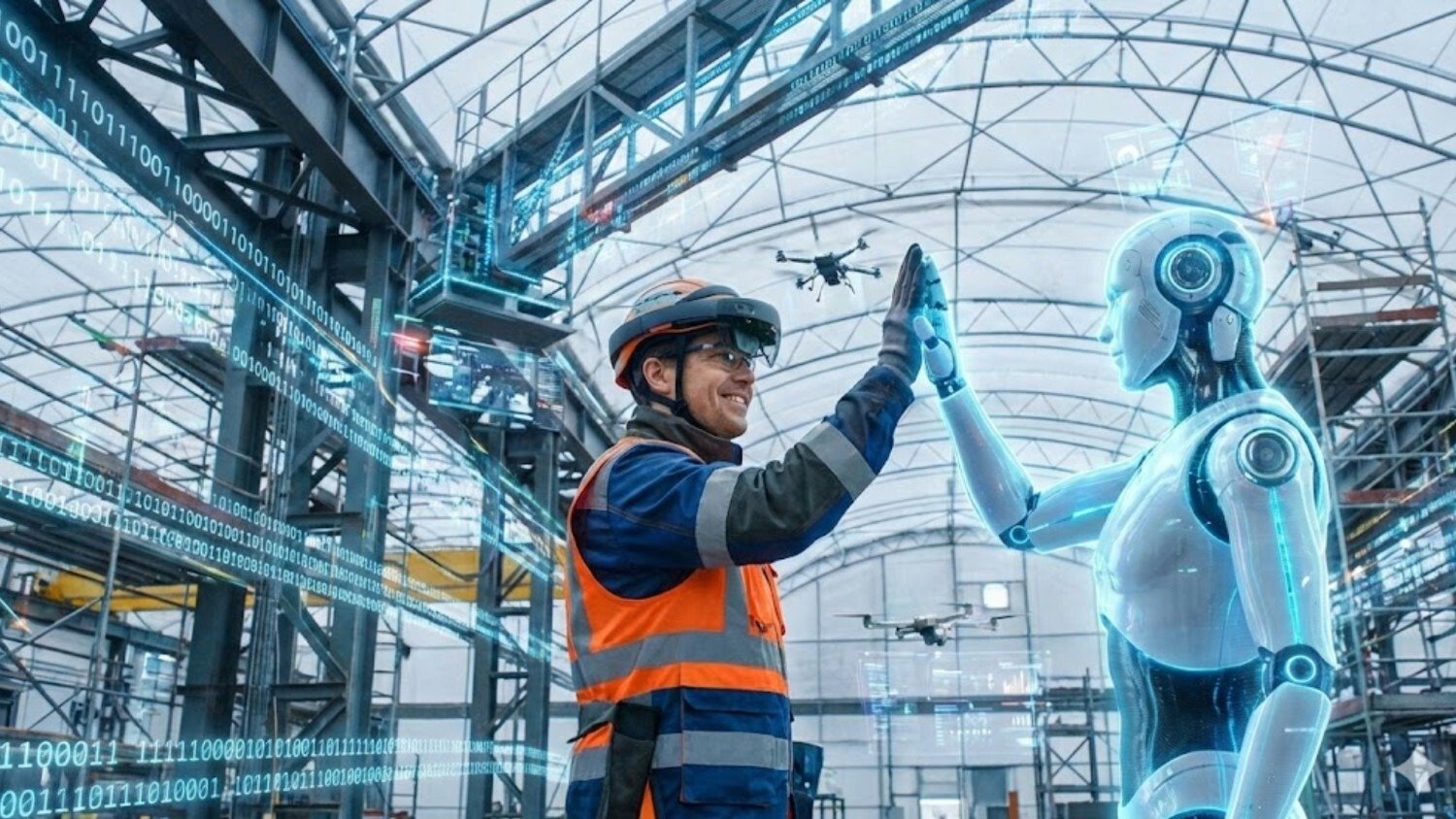The foreman points to a virtual scaffold; the engineer in London sees the pointer and highlights a stress fracture in red; the auditor pulls up the compliance data on a floating screen next to it. They are troubleshooting a hazardous situation in real-time, effectively "playing" the safety scenario together before a single boot hits the actual ground